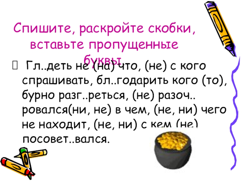 Спишите, раскройте скобки, вставьте пропущенные буквы.  Гл..деть не (на) что, (не) с кого спрашивать, бл..годарить кого