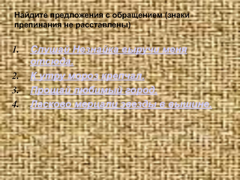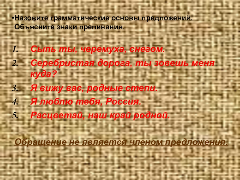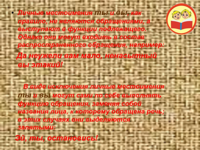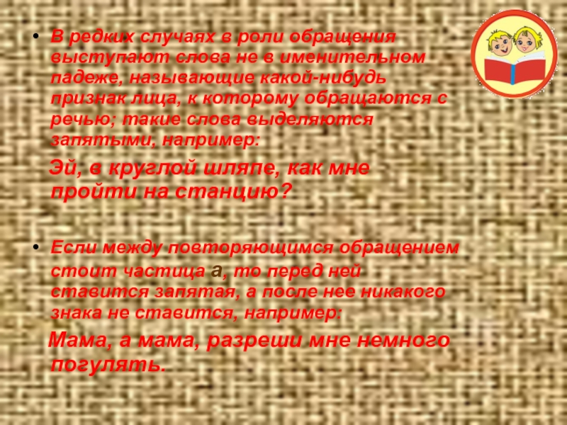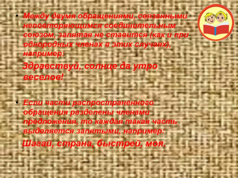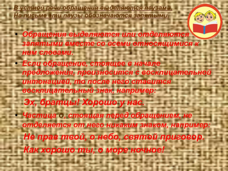 Обращения выделяются или отделяются запятыми вместе со всеми относящимися к ним словами.