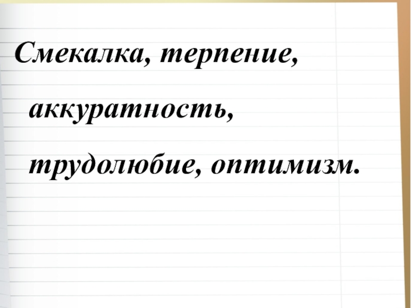 Слайд 3Смекалка, терпение, аккуратность, трудолюбие, оптимизм.