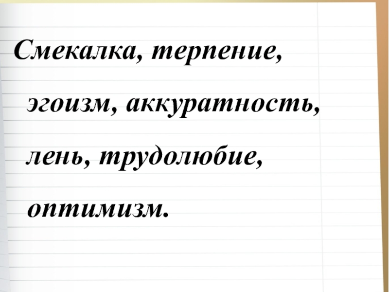 Слайд 2Смекалка, терпение, эгоизм, аккуратность, лень, трудолюбие, оптимизм.