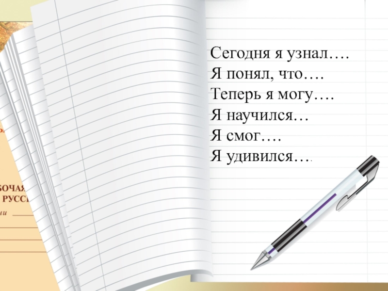 Сегодня я узнал….Я понял, что….Теперь я могу….Я научился…Я смог….Я удивился….
