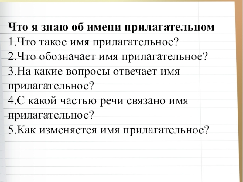 Что я знаю об имени прилагательном1.Что такое имя прилагательное?2.Что обозначает имя прилагательное?3.На какие вопросы отвечает имя прилагательное?4.С