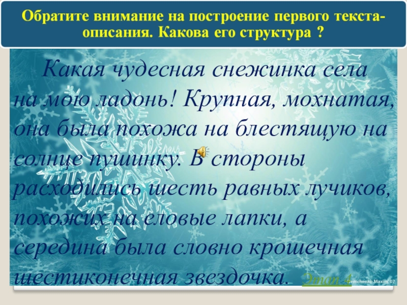мохнатая, она была похожа на блестящую на солнце пушинку. В стороны расходились шесть равных лучиков, похожих на еловые лапки, а середина была словно крошечная шестиконечная звездочка. Этап 4