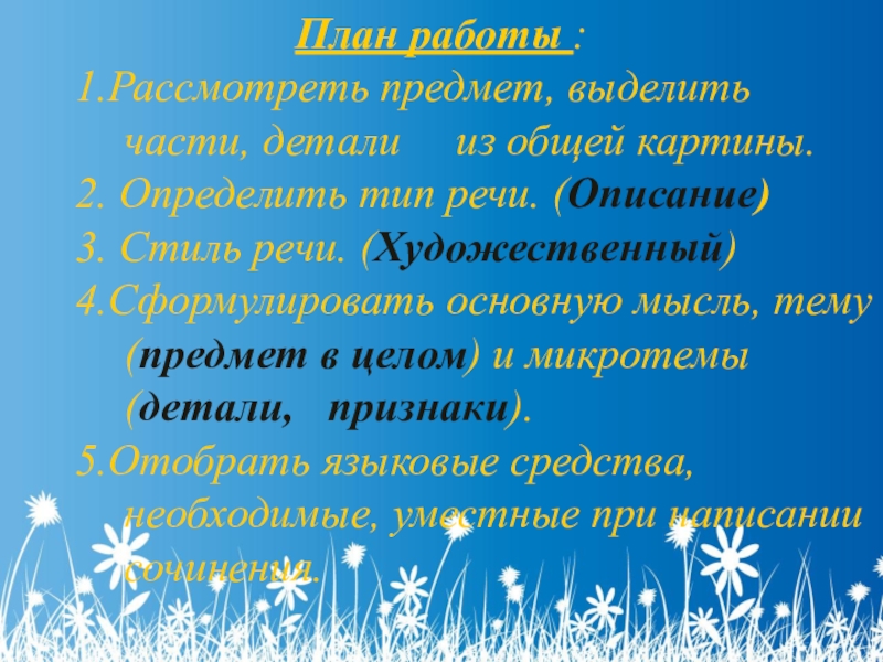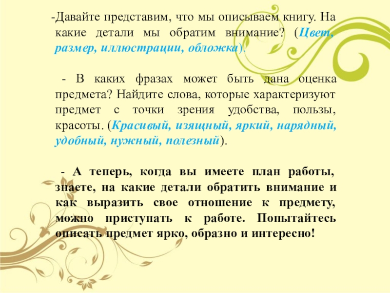 - А теперь, когда вы имеете план работы, знаете, на какие детали обратить внимание и как выразить свое отношение к предмету, можно приступать к работе. Попытайтесь описать предмет ярко, образно и интересно!