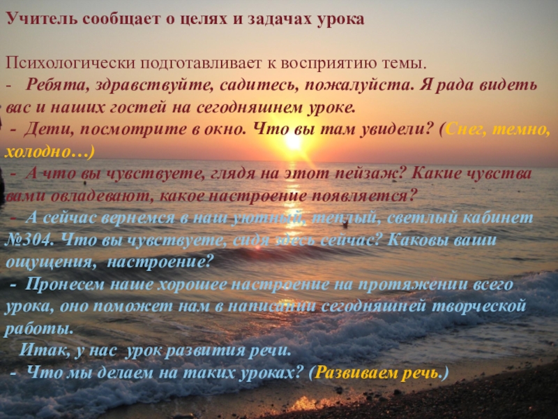 - Пронесем наше хорошее настроение на протяжении всего урока, оно поможет нам в написании сегодняшней творческой работы.