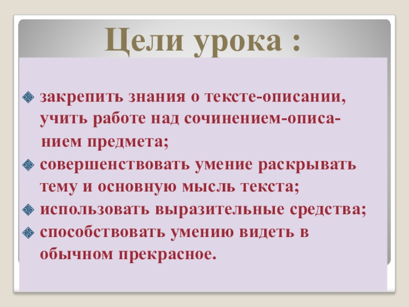 закрепить знания о тексте-описании, учить работе над сочинением-описа-