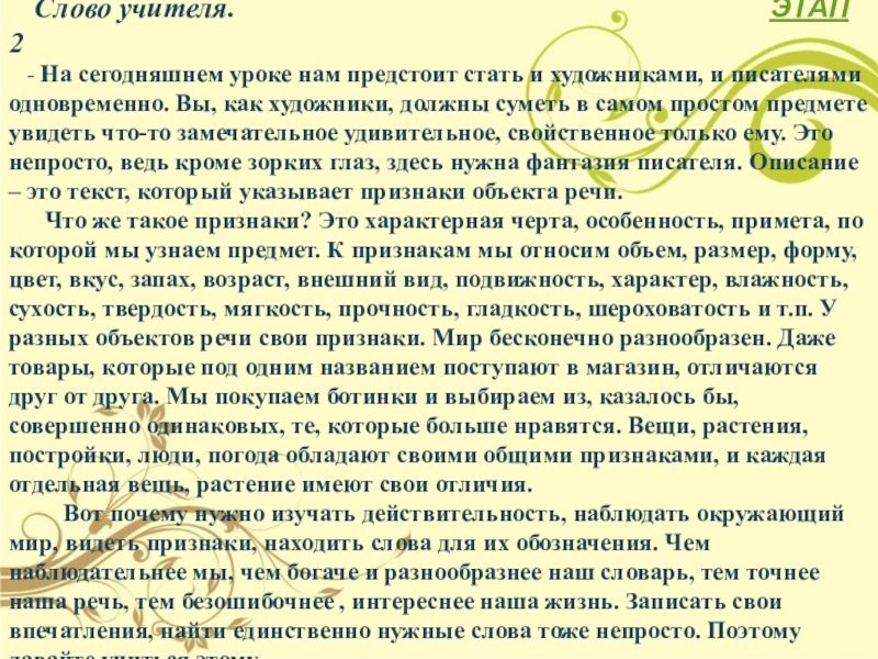 - На сегодняшнем уроке нам предстоит стать и художниками, и писателями одновременно. Вы, как художники, должны суметь в самом простом предмете увидеть что-то замечательное удивительное, свойственное только ему. Это непросто, ведь кроме зорких глаз, здесь нужна фантазия писателя. Описание – это текст, который указывает признаки объекта речи.