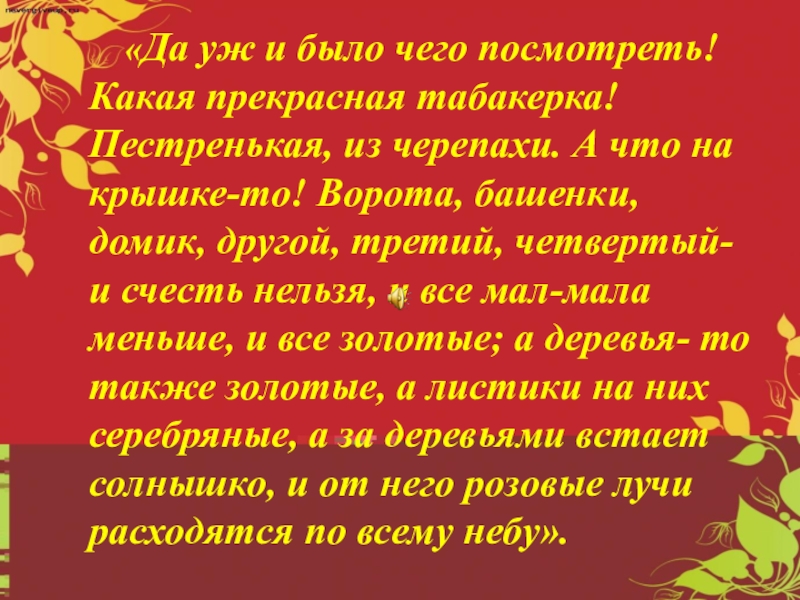 Пестренькая, из черепахи. А что на крышке-то! Ворота, башенки, домик, другой, третий, четвертый- и счесть нельзя, и все мал-мала меньше, и все золотые; а деревья- то также золотые, а листики на них серебряные, а за деревьями встает солнышко, и от него розовые лучи расходятся по всему небу».