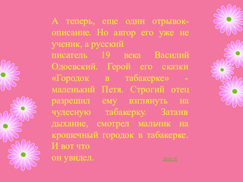 писатель 19 века Василий Одоевский. Герой его сказки «Городок в табакерке» - маленький Петя. Строгий отец разрешил ему взглянуть на чудесную табакерку. Затаив дыхание, смотрел мальчик на крошечный городок в табакерке. И вот что
