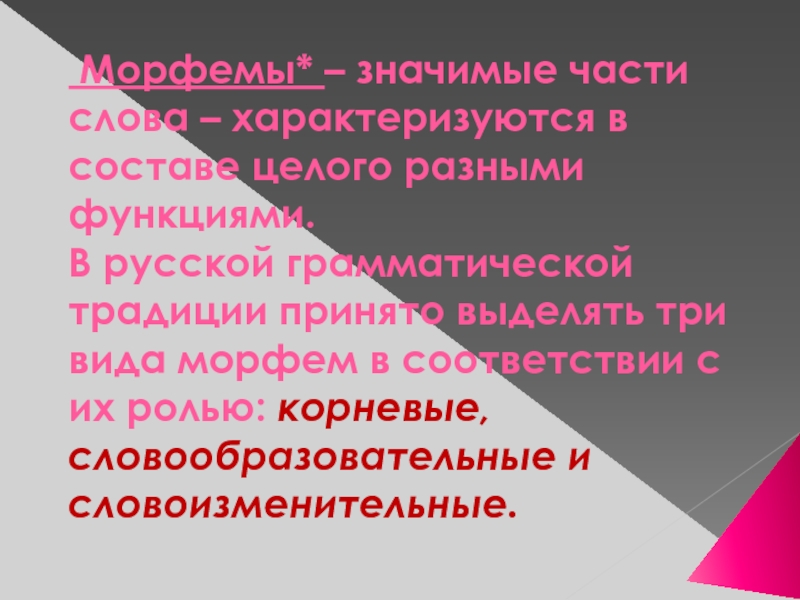 В русской грамматической традиции принято выделять три вида морфем в соответствии с их ролью: корневые, словообразовательные и словоизменительные.