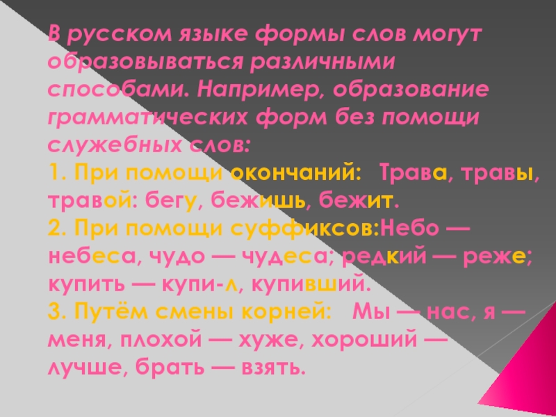 Слайд 7В русском языке формы слов могут образовываться различными способами. Например, образование