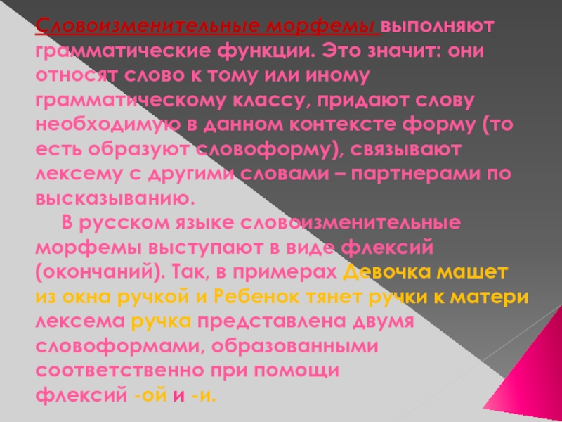 тому или иному грамматическому классу, придают слову необходимую в данном контексте форму (то есть образуют словоформу), связывают лексему с другими словами – партнерами по высказыванию.