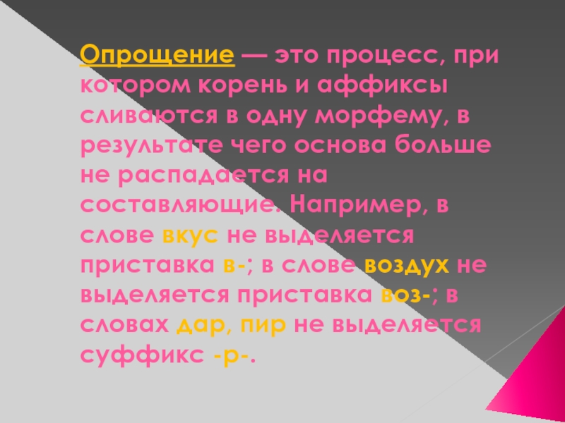 одну морфему, в результате чего основа больше не распадается на составляющие. Например, в слове вкус не выделяется приставка в-; в слове воздух не выделяется приставка воз-; в словах дар, пир не выделяется суффикс -р-.