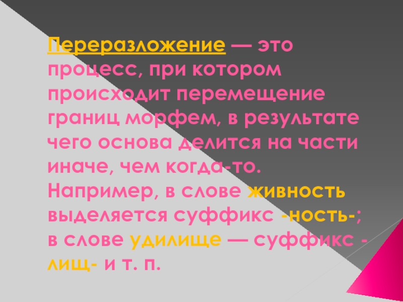 Слайд 12Переразложение — это процесс, при котором происходит перемещение границ морфем, в