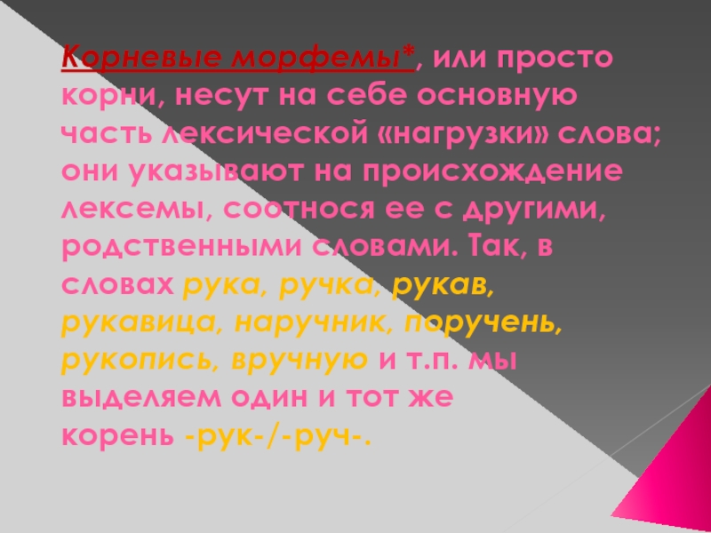 Слайд 3Корневые морфемы*, или просто корни, несут на себе основную часть лексической