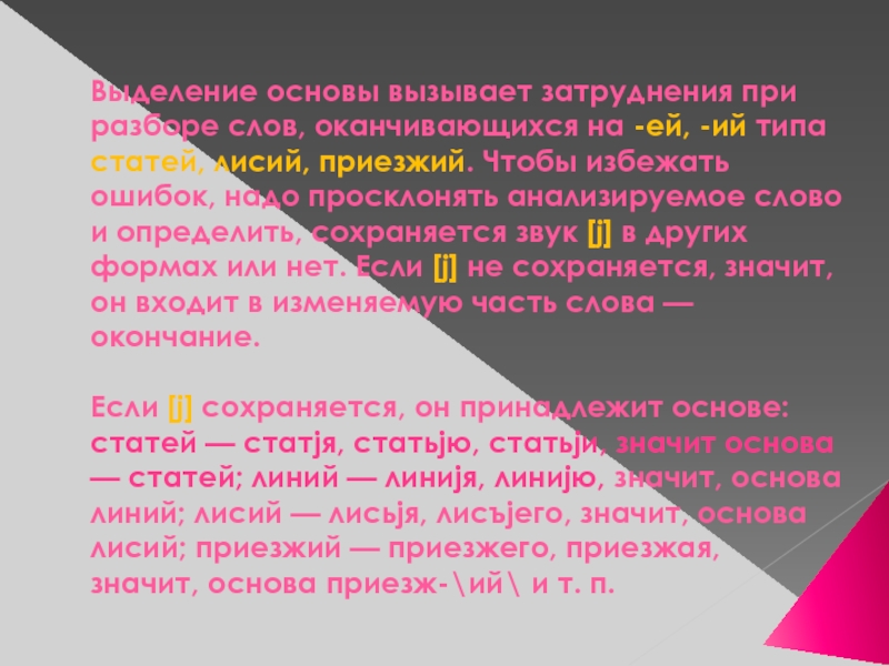 типа статей, лисий, приезжий. Чтобы избежать ошибок, надо просклонять анализируемое слово и определить, сохраняется звук [j] в других формах или нет. Если [j] не сохраняется, значит, он входит в изменяемую часть слова — окончание.