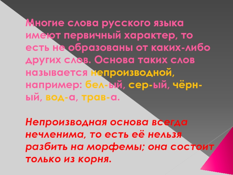 от каких-либо других слов. Основа таких слов называется непроизводной, например: бел-ый, сер-ый, чёрн-ый, вод-а, трав-а.
