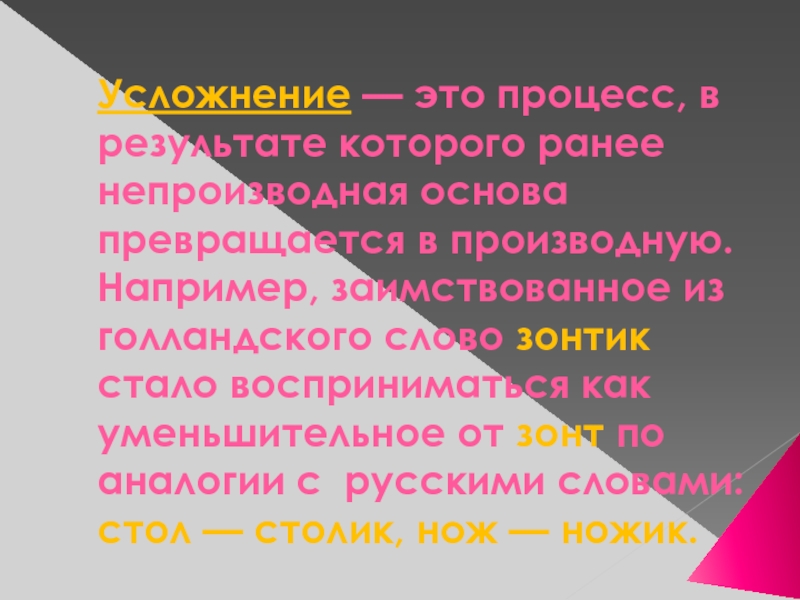 Слайд 13Усложнение — это процесс, в результате которого ранее непроизводная основа превращается