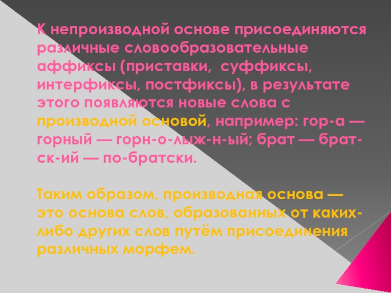 в результате этого появляются новые слова с производной основой, например: гор-а — горный — горн-о-лыж-н-ый; брат — брат-ск-ий — по-братски.