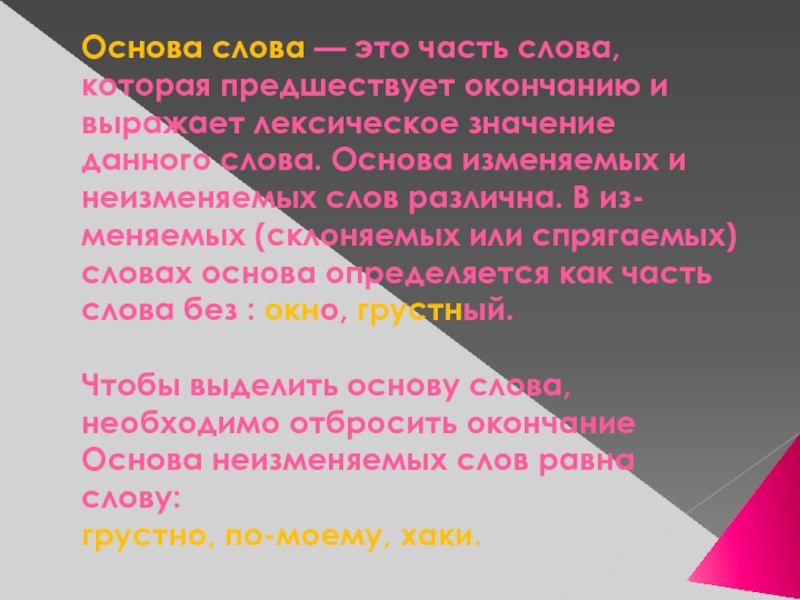 лексическое значение данного слова. Основа изменяемых и неизменяемых слов различна. В из-меняемых (склоняемых или спрягаемых) словах основа определяется как часть слова без : окно, грустный.