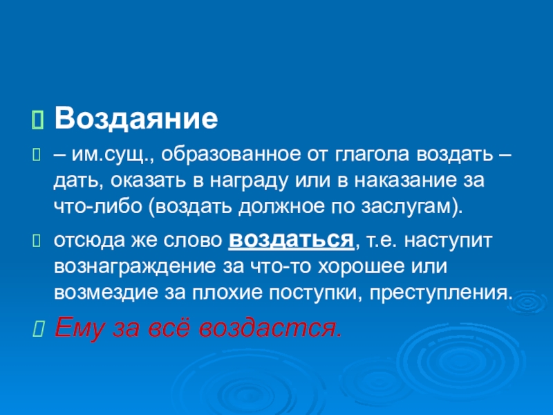 отсюда же слово воздаться, т.е. наступит вознаграждение за что-то хорошее или возмездие за плохие поступки, преступления.