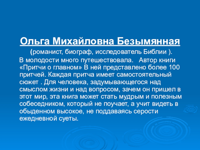 В молодости много путешествовала. Автор книги «Притчи о главном» В ней представлено более 100 притчей. Каждая притча имеет самостоятельный сюжет . Для человека, задумывающегося над смыслом жизни и над вопросом, зачем он пришел в этот мир, эта книга может стать мудрым и полезным собеседником, который не поучает, а учит видеть в обыденном высокое, не поддаваясь серости ежедневной суеты.
