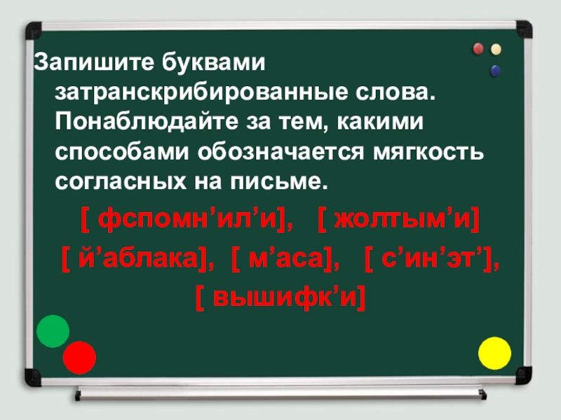 Слайд 16Запишите буквами затранскрибированные слова. Понаблюдайте за тем, какими способами обозначается мягкость