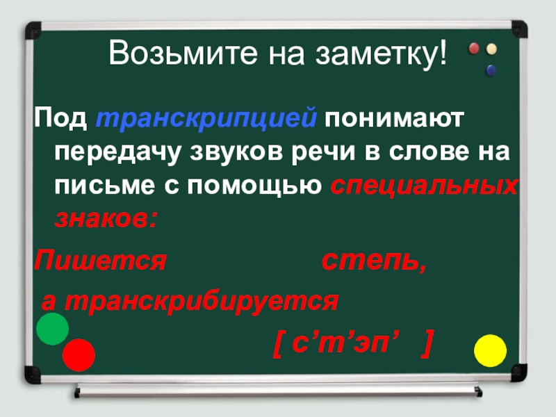 Возьмите на заметку!Под транскрипцией понимают передачу звуков речи в слове на письме с помощью специальных знаков:Пишется