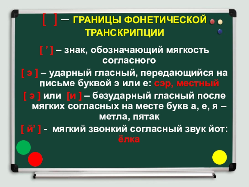 [ ] – ГРАНИЦЫ ФОНЕТИЧЕСКОЙ ТРАНСКРИПЦИИ[ ’ ] – знак, обозначающий мягкость согласного[ э ] – ударный