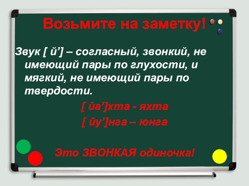 Возьмите на заметку!Звук [ й’] – согласный, звонкий, не имеющий пары по глухости, и мягкий, не имеющий