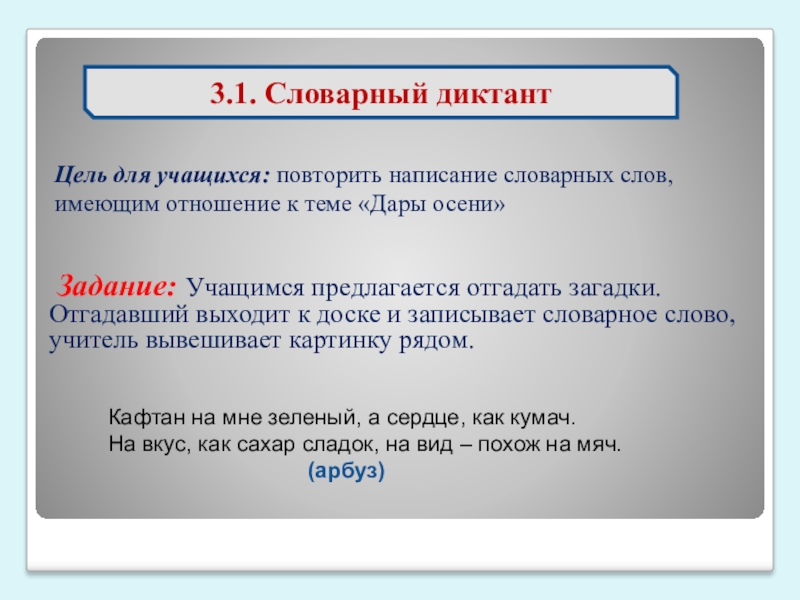 Задание: Учащимся предлагается отгадать загадки. Отгадавший выходит к доске и записывает словарное слово, учитель вывешивает картинку рядом.