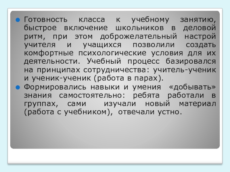 при этом доброжелательный настрой учителя и учащихся позволили создать комфортные психологические условия для их деятельности. Учебный процесс базировался на принципах сотрудничества: учитель-ученик и ученик-ученик (работа в парах).