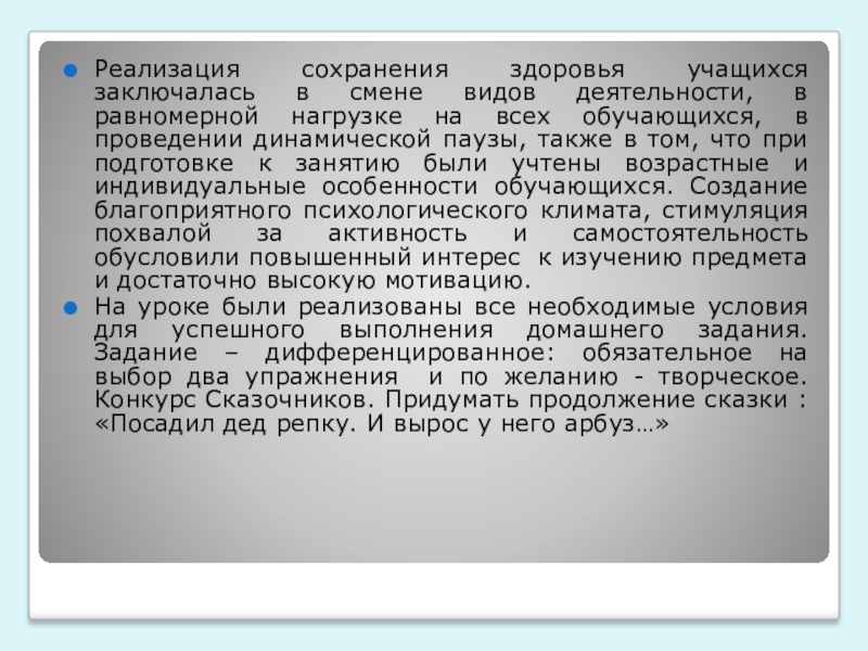 Слайд 39Реализация сохранения здоровья учащихся заключалась в смене видов деятельности, в равномерной