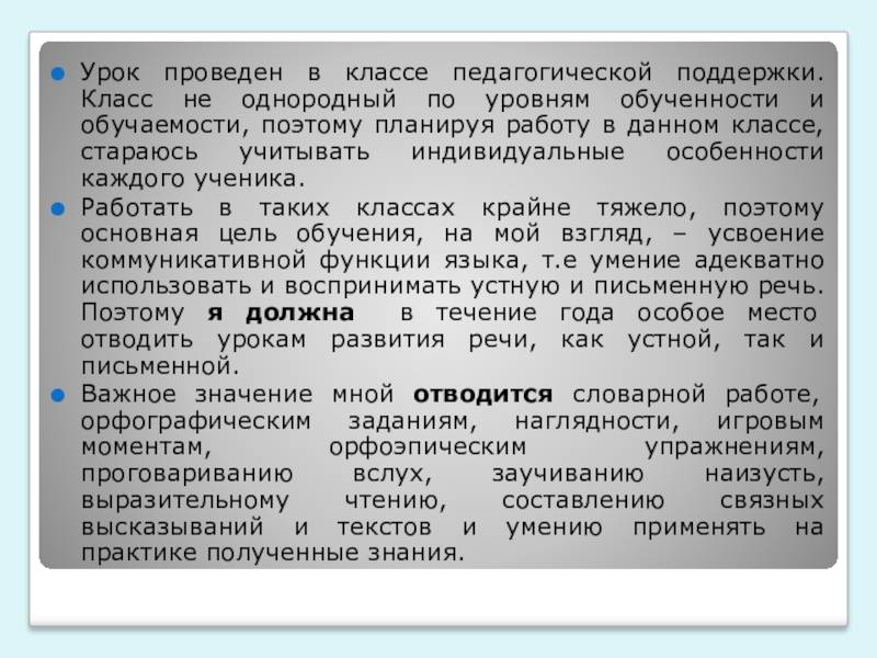 Важное значение мной отводится словарной работе, орфографическим заданиям, наглядности, игровым моментам, орфоэпическим упражнениям, проговариванию вслух, заучиванию наизусть, выразительному чтению, составлению связных высказываний и текстов и умению применять на практике полученные знания.