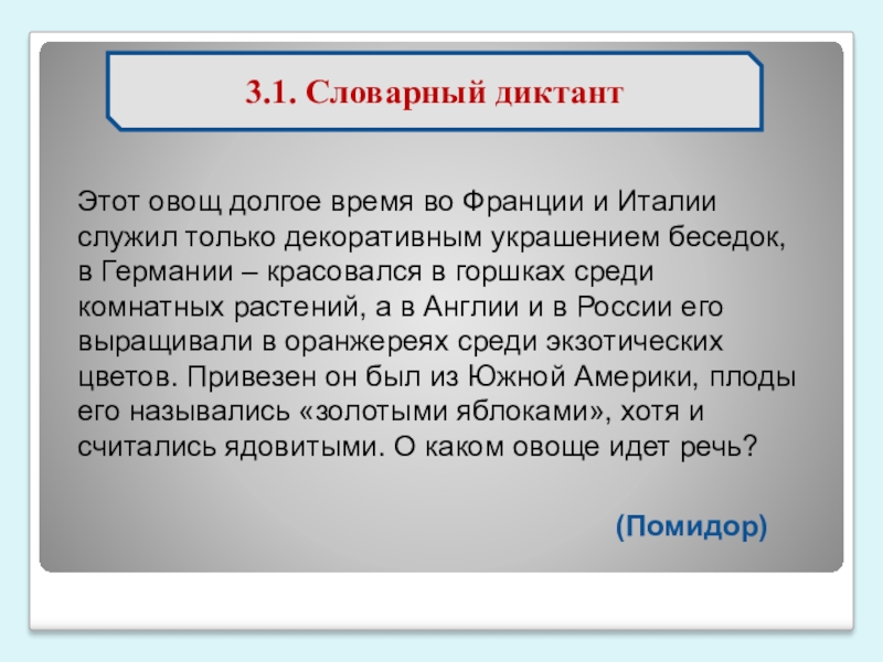 служил только декоративным украшением беседок, в Германии – красовался в горшках среди комнатных растений, а в Англии и в России его выращивали в оранжереях среди экзотических цветов. Привезен он был из Южной Америки, плоды его назывались «золотыми яблоками», хотя и считались ядовитыми. О каком овоще идет речь?