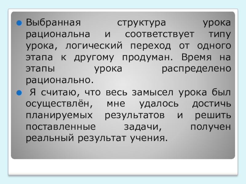 Слайд 41Выбранная структура урока рациональна и соответствует типу урока, логический переход от