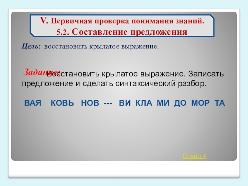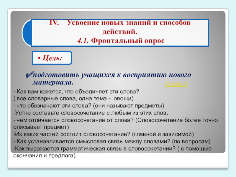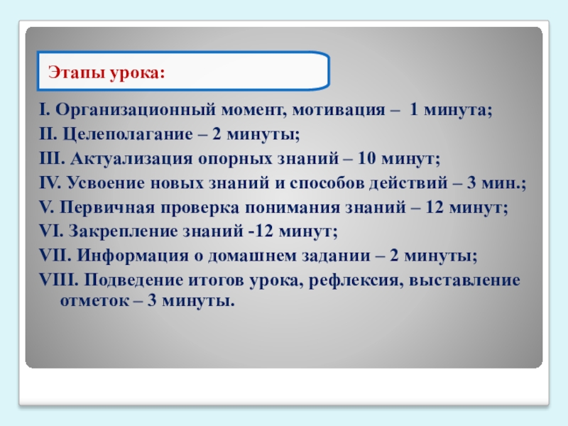 IV. Усвоение новых знаний и способов действий – 3 мин.;