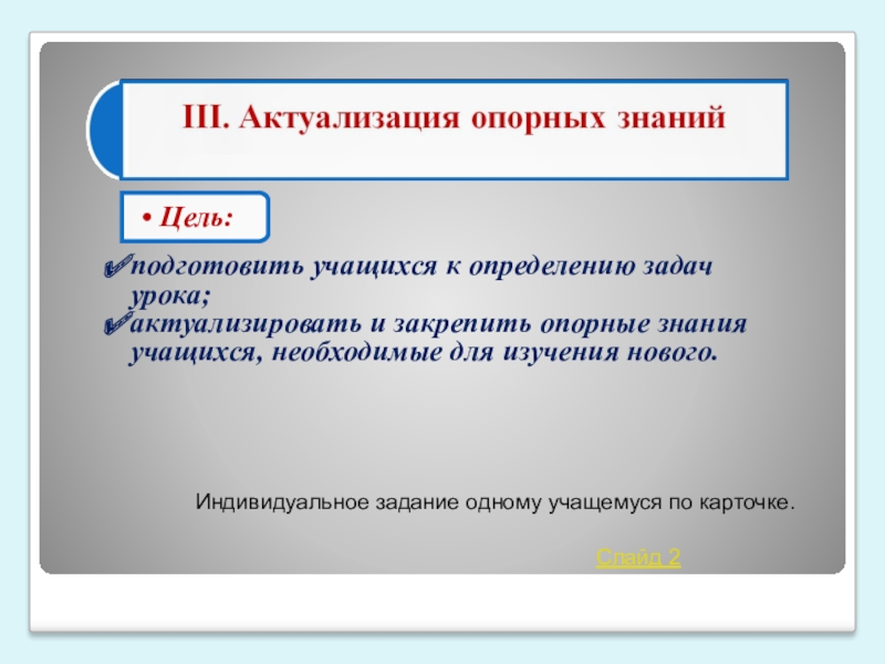 Актуализация знаний проводилась в устной форме в виде фронтального опроса и во время самостоятельной работы.
