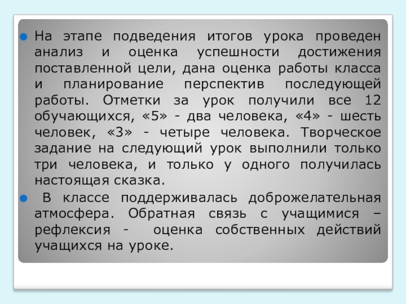 поставленной цели, дана оценка работы класса и планирование перспектив последующей работы. Отметки за урок получили все 12 обучающихся, «5» - два человека, «4» - шесть человек, «3» - четыре человека. Творческое задание на следующий урок выполнили только три человека, и только у одного получилась настоящая сказка.