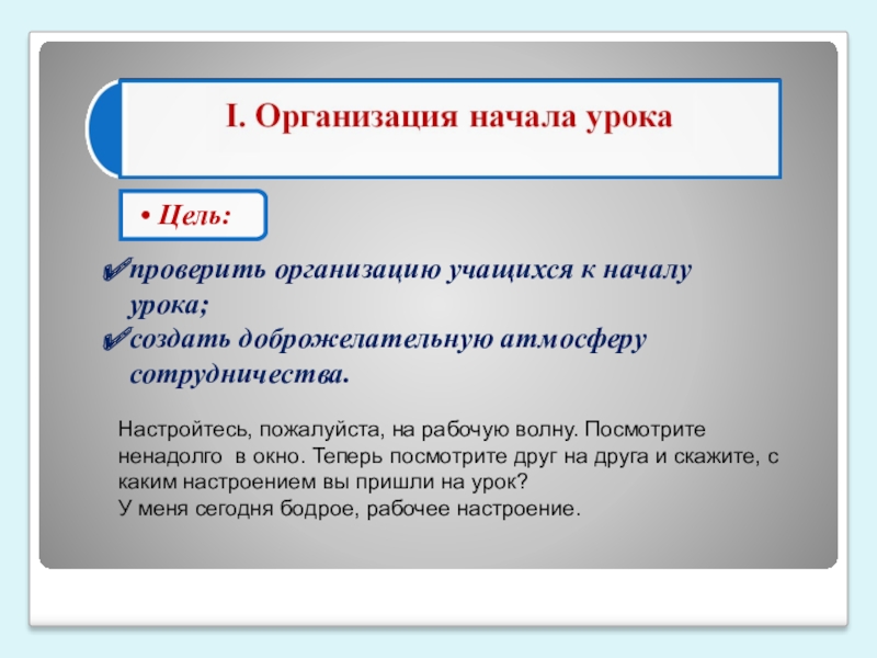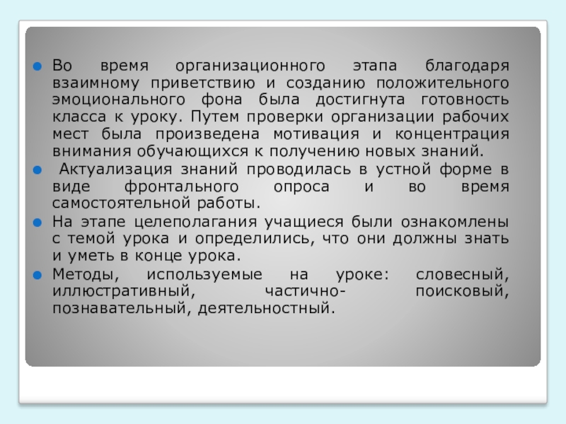 фона была достигнута готовность класса к уроку. Путем проверки организации рабочих мест была произведена мотивация и концентрация внимания обучающихся к получению новых знаний.