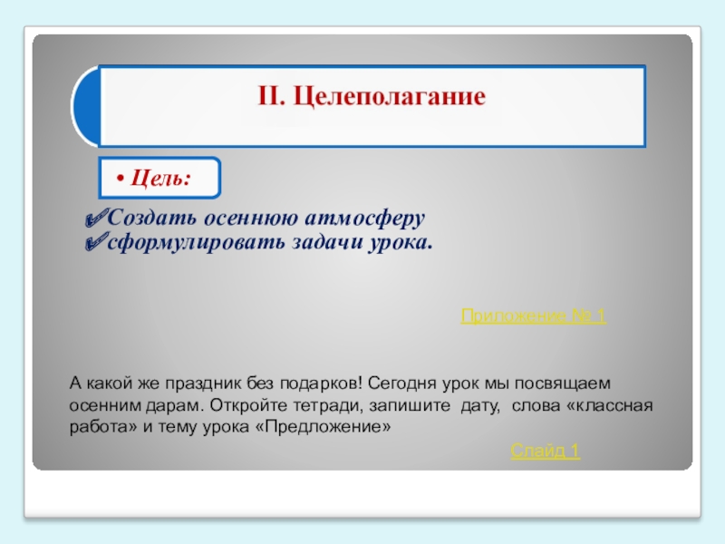 подарков! Сегодня урок мы посвящаем осенним дарам. Откройте тетради, запишите дату, слова «классная работа» и тему урока «Предложение»