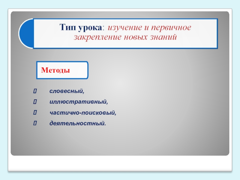 Методы, используемые на уроке: словесный, иллюстративный, частично- поисковый, познавательный, деятельностный.