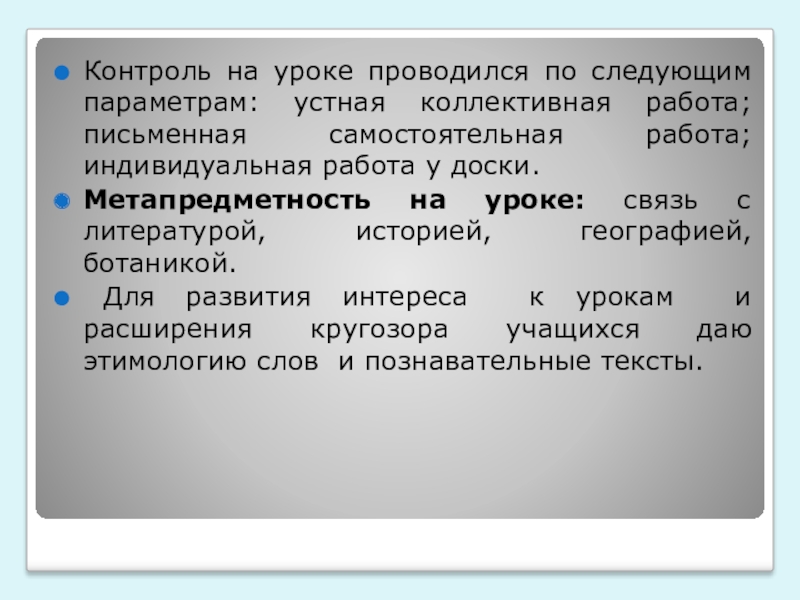 Слайд 36Контроль на уроке проводился по следующим параметрам: устная коллективная работа; письменная