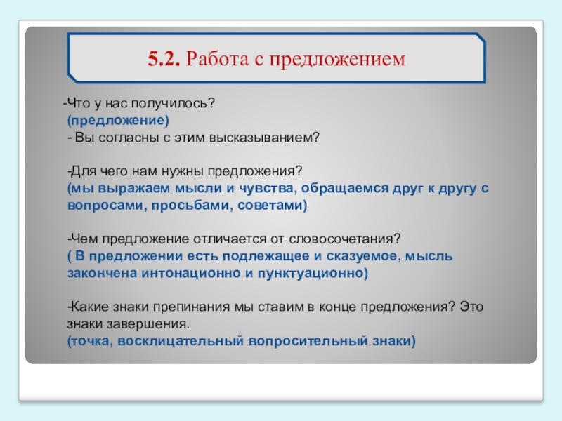 Тип урока - изучение и первичное закрепление новых знаний. Тема «Предложение» логически продолжает знакомить с базовыми понятиями пятиклассников после изучение темы «Строение словосочетания». В разделе «Синтаксис и Пунктуация» это седьмой урок.