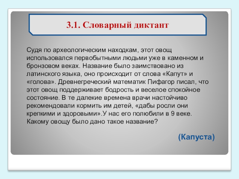 людьми уже в каменном и бронзовом веках. Название было заимствовано из латинского языка, оно происходит от слова «Капут» и «голова». Древнегреческий математик Пифагор писал, что этот овощ поддерживает бодрость и веселое спокойное состояние. В те далекие времена врачи настойчиво рекомендовали кормить им детей, «дабы росли они крепкими и здоровыми».У нас его полюбили в 9 веке. Какому овощу было дано такое название?