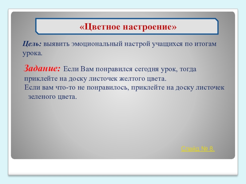 Цель: выявить эмоциональный настрой учащихся по итогам урока.