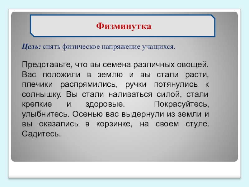 Слайд 26Цель: снять физическое напряжение учащихся.