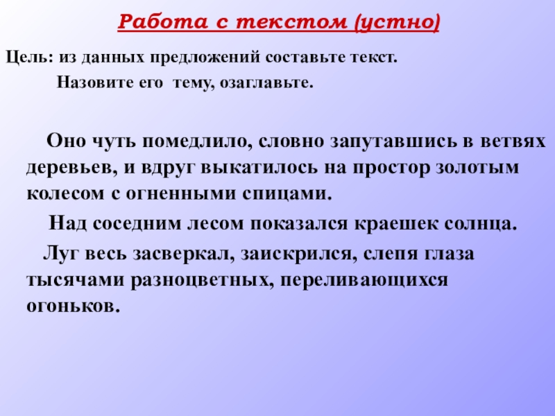 Работа с текстом (устно)Цель: из данных предложений составьте текст.      Назовите его тему,