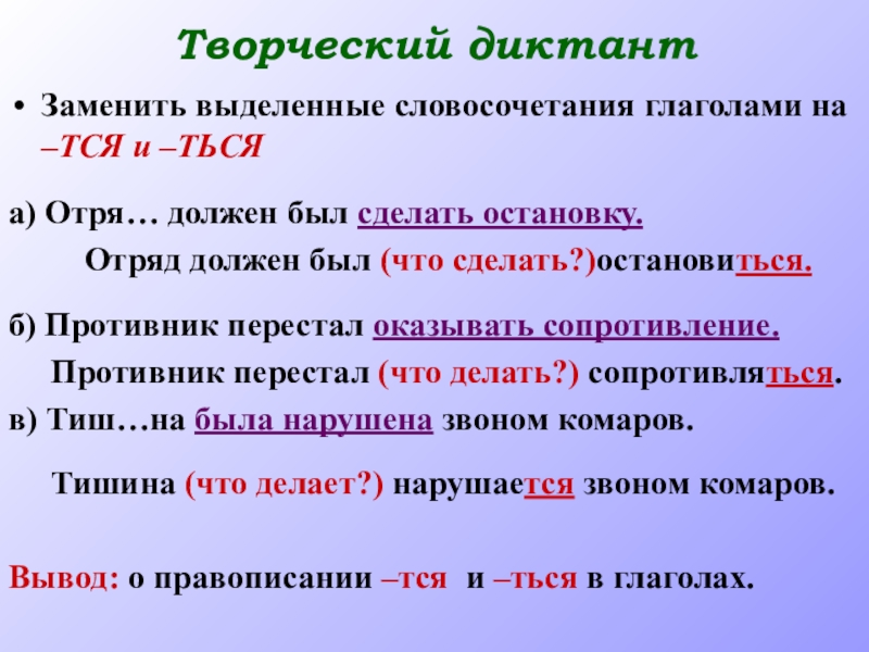 Творческий диктантЗаменить выделенные словосочетания глаголами на –ТСЯ и –ТЬСЯа) Отря… должен был сделать остановку.