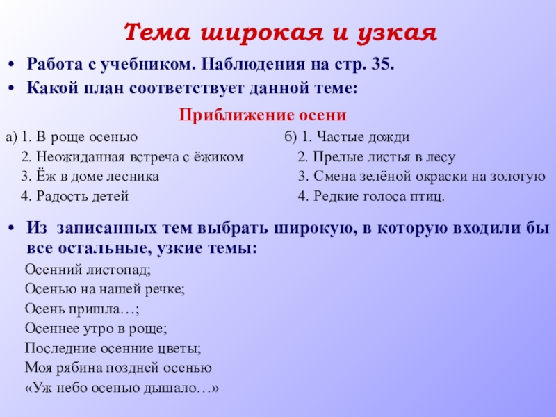Тема широкая и узкаяРабота с учебником. Наблюдения на стр. 35.Какой план соответствует данной теме: